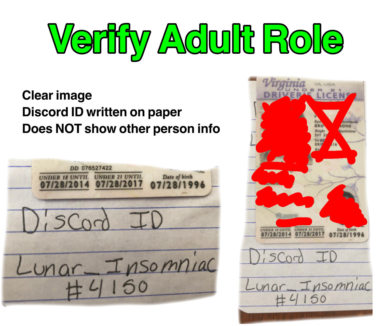 To do this you will go to ticket support system and type out !ticketThis will prompt our ticket bot to open a temporary channel that only the mods will be able to see as well yourself. Posted below is an example of how we need the ID to be shown.Once verified we will add the “Adult” Role to your account. After the role is added you will have access to the rest of the server and the ticket will be closed, unless you have any questions.