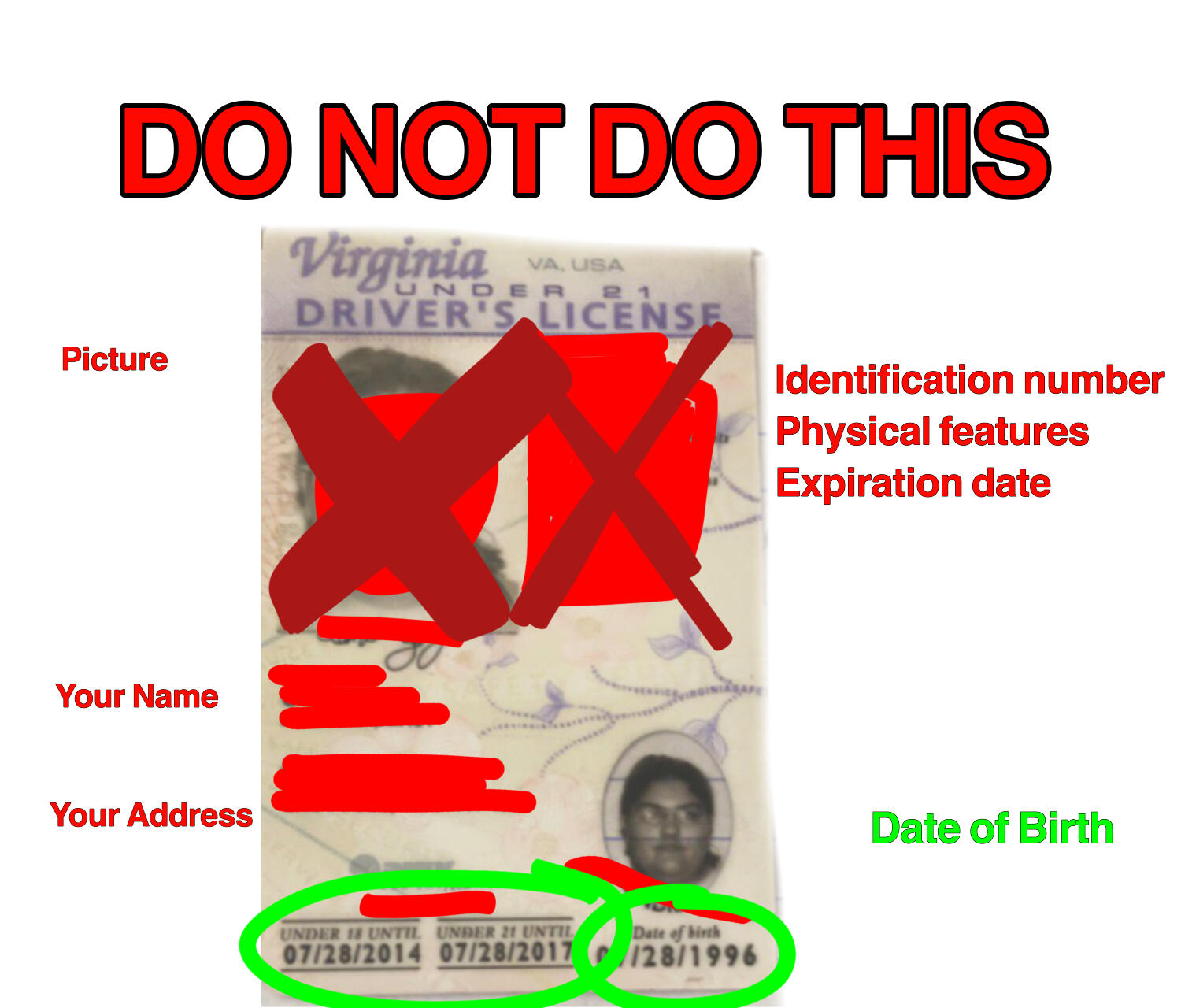 We have had many who will send an uncensored version that shows all of their information. While we appreciate the trust, this is very dangerous to do. No server should ask you for your full ID. You may cover the information, block it out as the example has been done with, or can show the portion with your DOB only.